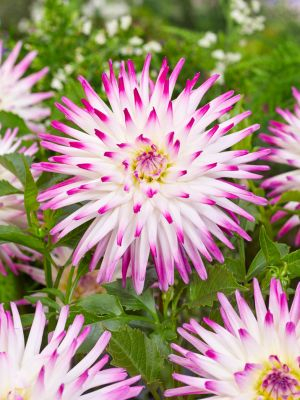 Dalie Hayley Jane tip cactus, culoare alb cu roz-mov, inaltime 100-150 cm.
