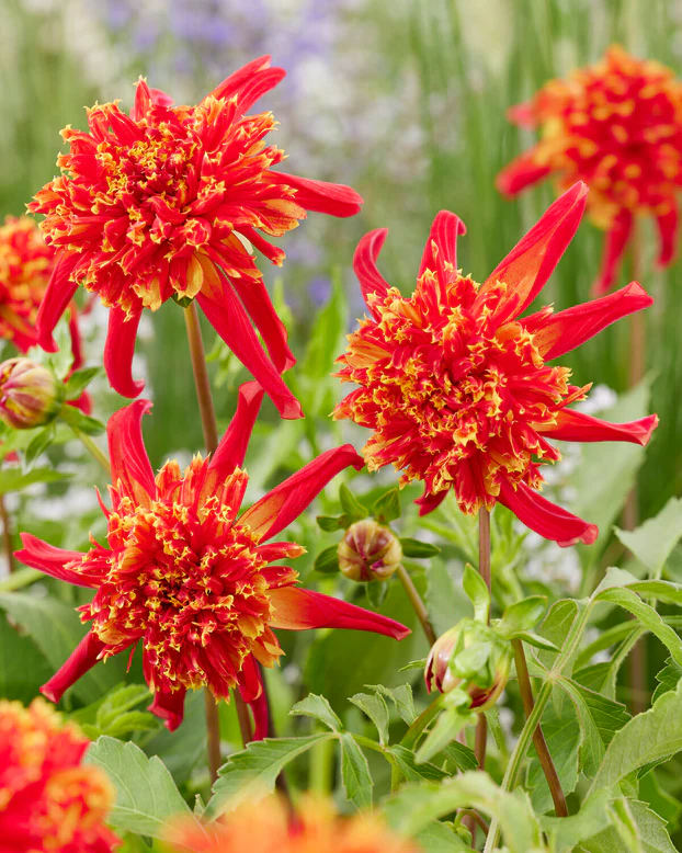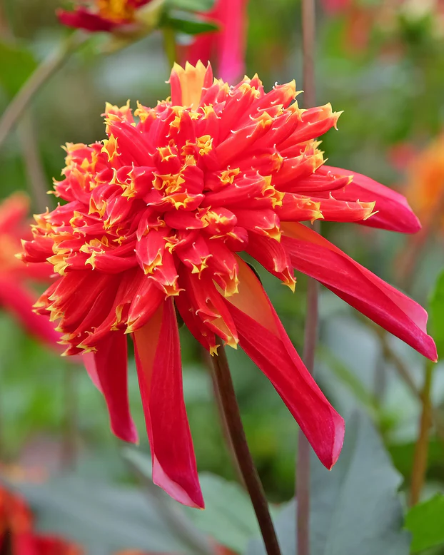 Dalie anemona Octopus cu o forma unica de unde si numele , culoare rosie cu galben pe varful petalelor, inaltime 100-120 cm, dimensiunea florilor 10 cm, foarte potrivita pentru buchete.