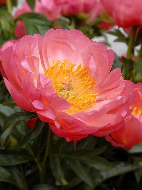 Bujorul Coral Sunset este o plantă perenă erbacee cu flori semiduble care se deschid într-un roz-coral vibrant și se estompează treptat în nuanțe de caisă și galben pe măsură ce se maturizează, asemănându-se cu un apus de soare. Prezintă un pâlc stufos de frunziș verde închis, atinge o înălțime de aproximativ 70-90 cm și are un parfum ușor. Planta este cunoscută pentru tulpinile sale puternice și erecte, florile tăiate de lungă durată și este cel mai bine cultivată în sol fertil, bine drenat, la soare sau parțial în umbră.