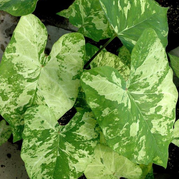 Aspectul frunzelor: Frunzele au formă de inimă (sau „urechi de elefant”) și prezintă un amestec vibrant de verde neon (lime) stropit peste un fundal verde închis.