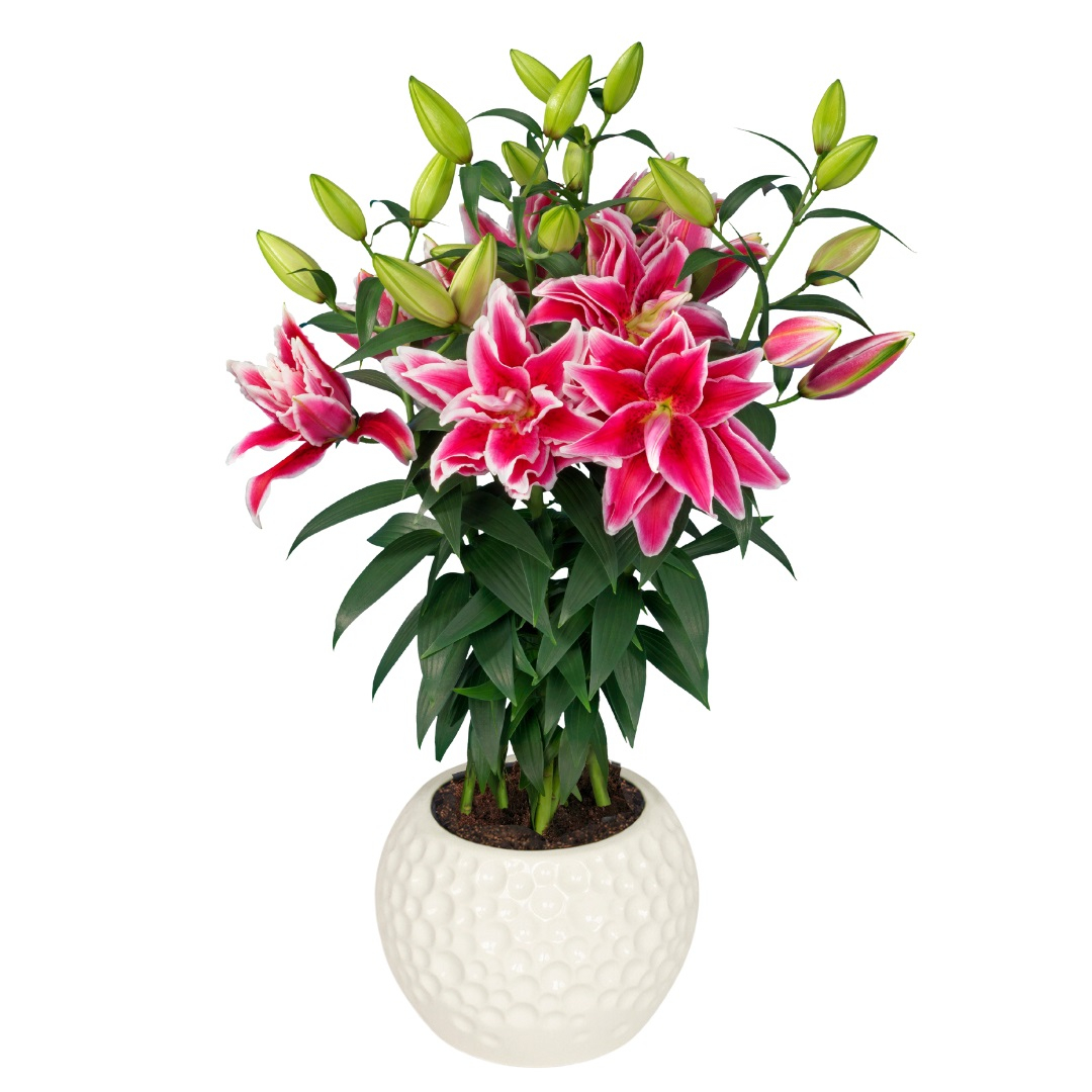 Crin trandafir , crin dublu oriental , crin batut Kyra potrivit pentru ghiveci. Are o inaltime de 40-50 cm , este fara polen astfel ca este foarte potrivit pentru interior sau terasa. Are o durata de 15-16 saptamani de la plantare la inflorire.