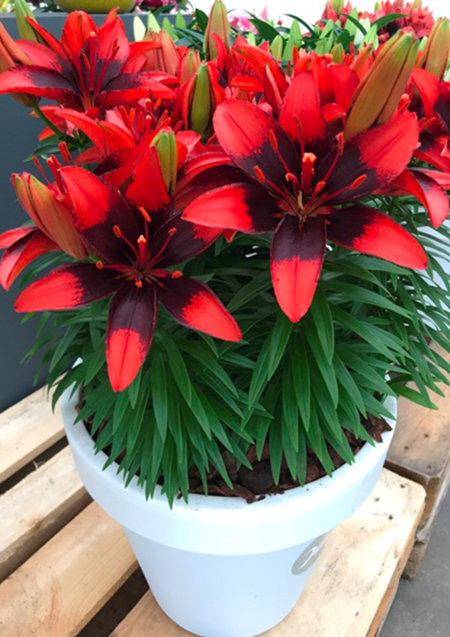 Crin asiatic bicolor pentru ghiveci Tiny Ink .Este ca orice alt crin doar ca are o inaltime mai mica de 40 cm pentru a putea fi crescut in ghiveci chiar si in casa, Infloreste in 8-9 saptamani de la plantare. Neparfumat.
