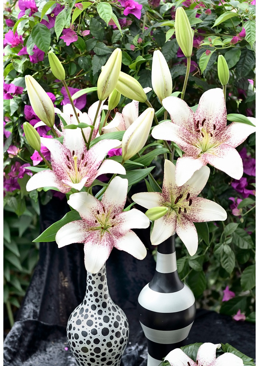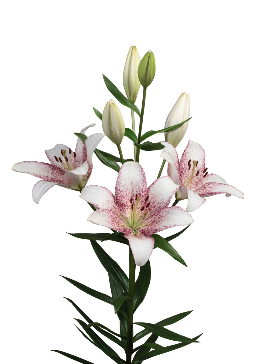 Crin LA ( longiflorum-asiatic ) de culoare alba cu interiorul mov inchis. Discret parfumat, inaltime 120 cm, infloreste devreme la sfarsit de iunie-inceput de iulie.